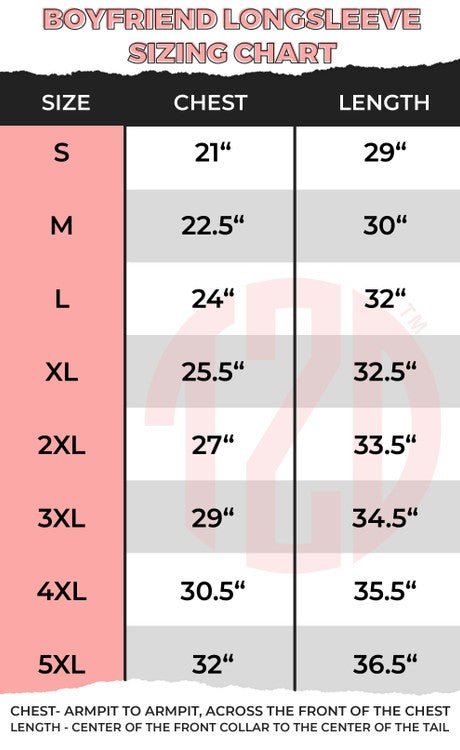 Sizing Hint: This is a boyfriend cut long sleeve tee, which fits a bit oversized, size down if your in between sizes. See additional images for sizing charts.